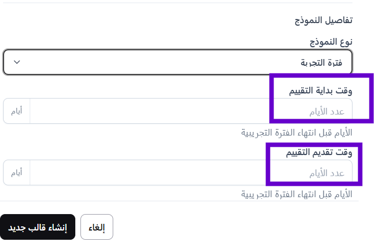عند اختيار هذا النوع، يمكن للمستخدم تحديد عدد الأيام التي سيبدأ فيها التقييم قبل انتهاء فترة التجربة، وعدد الأيام التي سيتم تقديم نموذج التقييم فيها قبل انتهاء فترة التجربة.