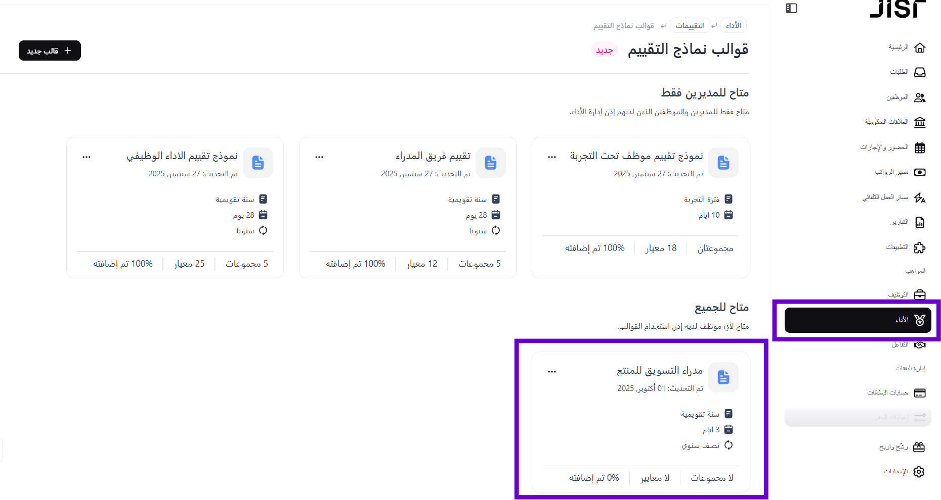 لتعزيز جهودنا المستمرة في تحسين عملية الأداء، أصبحت قوالب نماذج التقييم متاحة ضمن إدارة عملية تقييمات الأداء على نظام جسر. وذلك ليتمكن المستخدمون من استخدام هذه القوالب بشكل متكرر عبر فترات تقييم مختلفة. هذا التطوير يوفر مزايا لمجموعة متنوعة من الشركات، لتلبية احتياجاتها المختلفة.