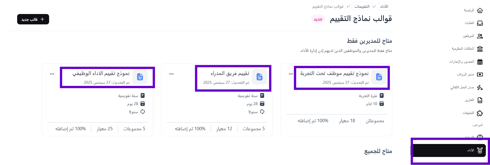 في صفحة القوالب، سيكون هناك قسمين: أحدهما للنماذج المتاحة حصريًا للمديرين والموظفين الذين لديهم صلاحيات "إدارة الأداء" ، والآخر للنماذج المتاحة لجميع المستخدمين الذين لديهم "صلاحية استخدام القوالب".