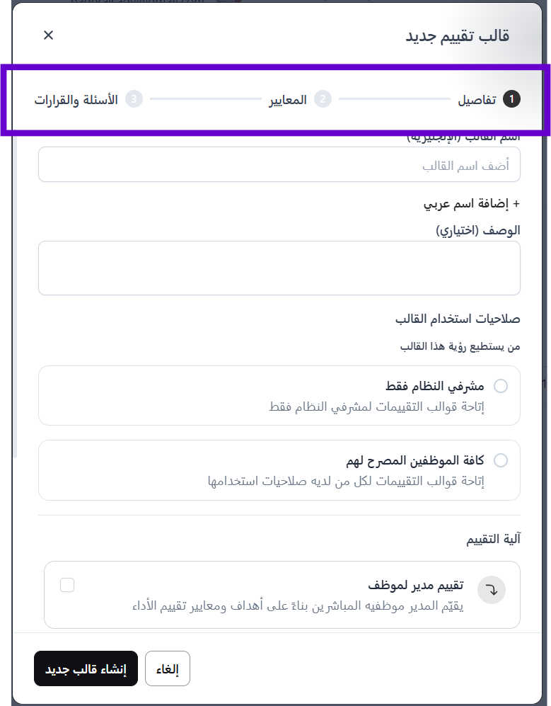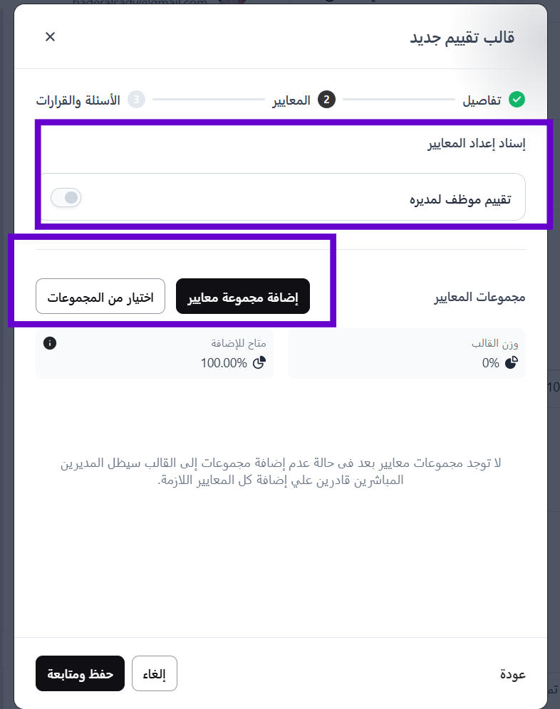 بعد إكمال تفاصيل النموذج، اضغط على "إنشاء قالب". بعد ذلك، يمكن للمستخدمين إنشاء مجموعات لوضع معايير تقييم للقالب الجديد، بالتالي ستنعكس هذه المعايير على آلية التقييم المختارة مسبقًا.
