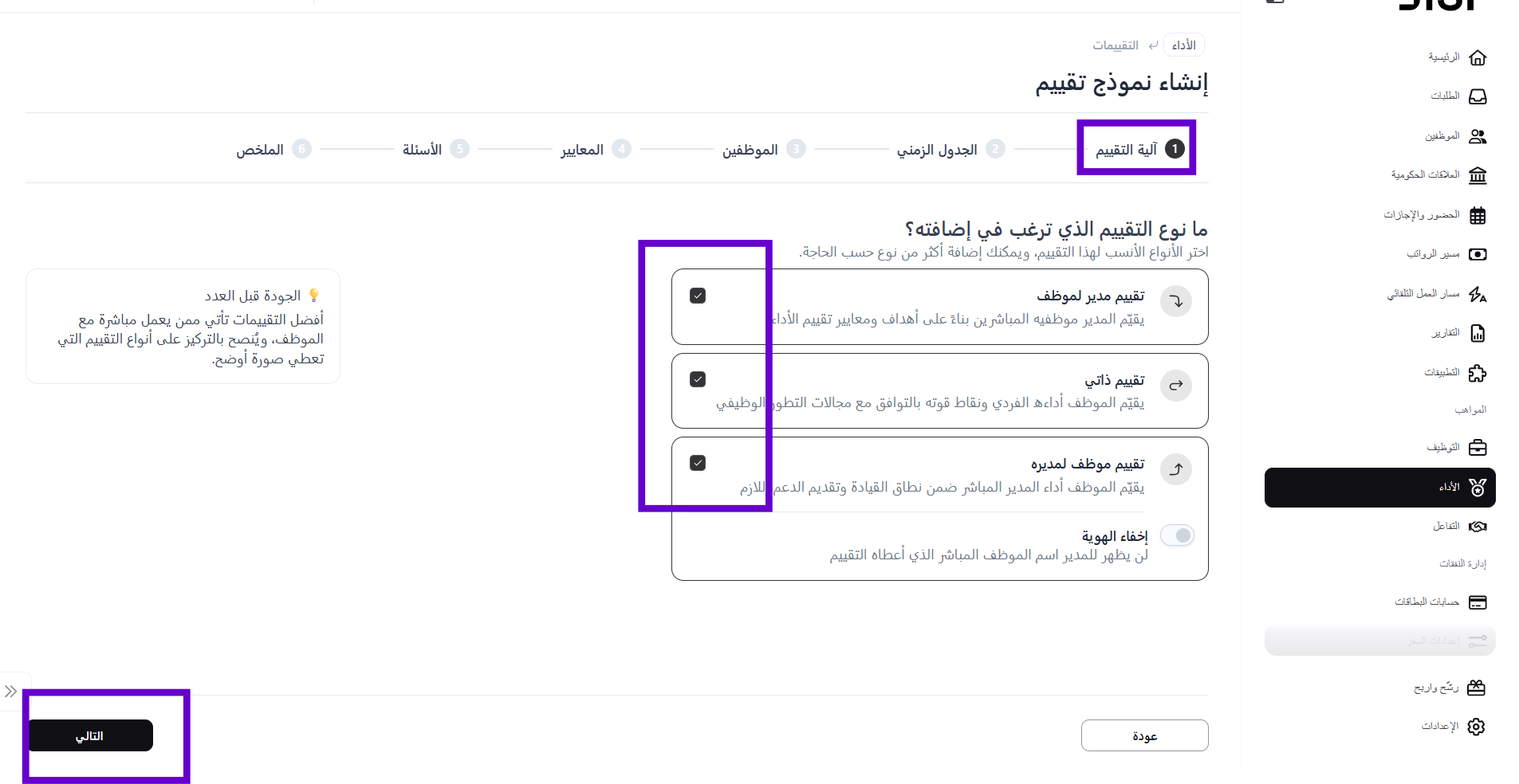 - عند الوصول إلى خطوة "آلية التقييم" في النموذج، ستكون الآلية المختارة مسبقًا في القالب مفعلة تلقائيًا.