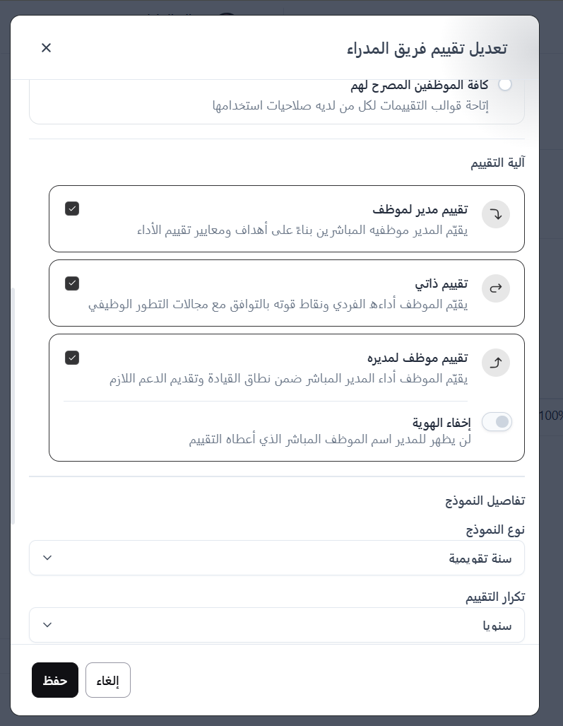 هذا الخيار يفتح صفحة 'إنشاء نموذج تقييم'، حيث يمكن للمستخدمين إنشاء نموذج تقييم جديد، وملأ تفاصيله، وإضافة الموظفين المكلفين به.