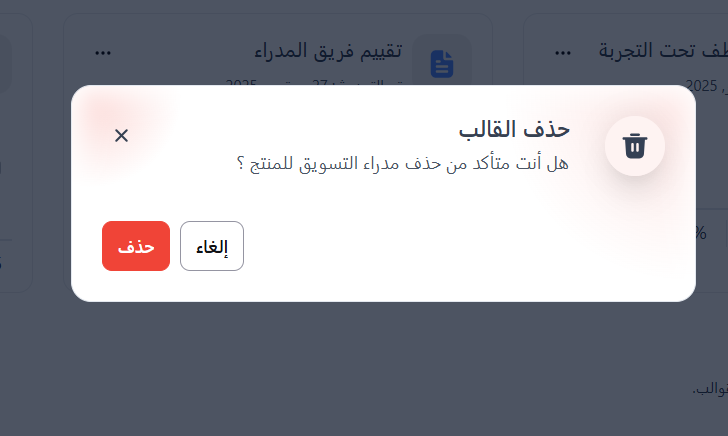 يظهر للمستخدمين الذين لديهم صلاحية الحذف رسالة تأكيد قبل حذف القالب.