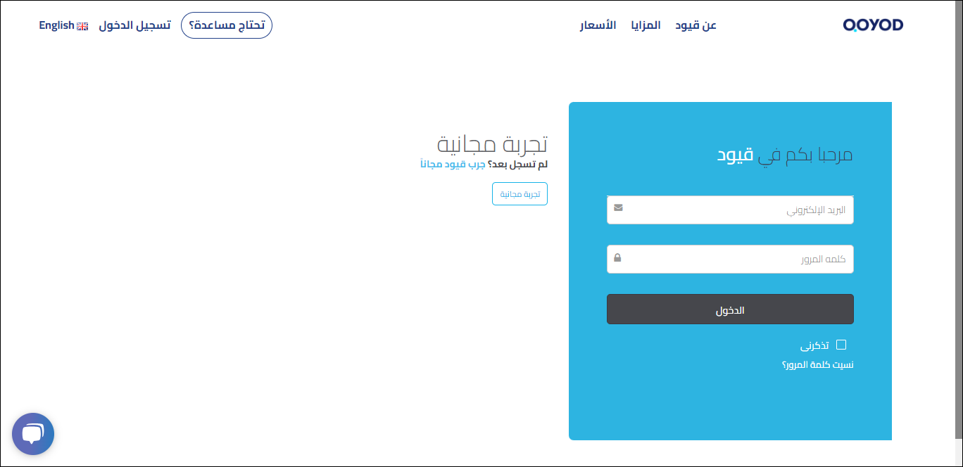 يقوم المستخدم بتسجيل الدخول على قيود في النافذة المنبثقة من خلال إدخال البريد الإلكتروني وكلمة المرور.