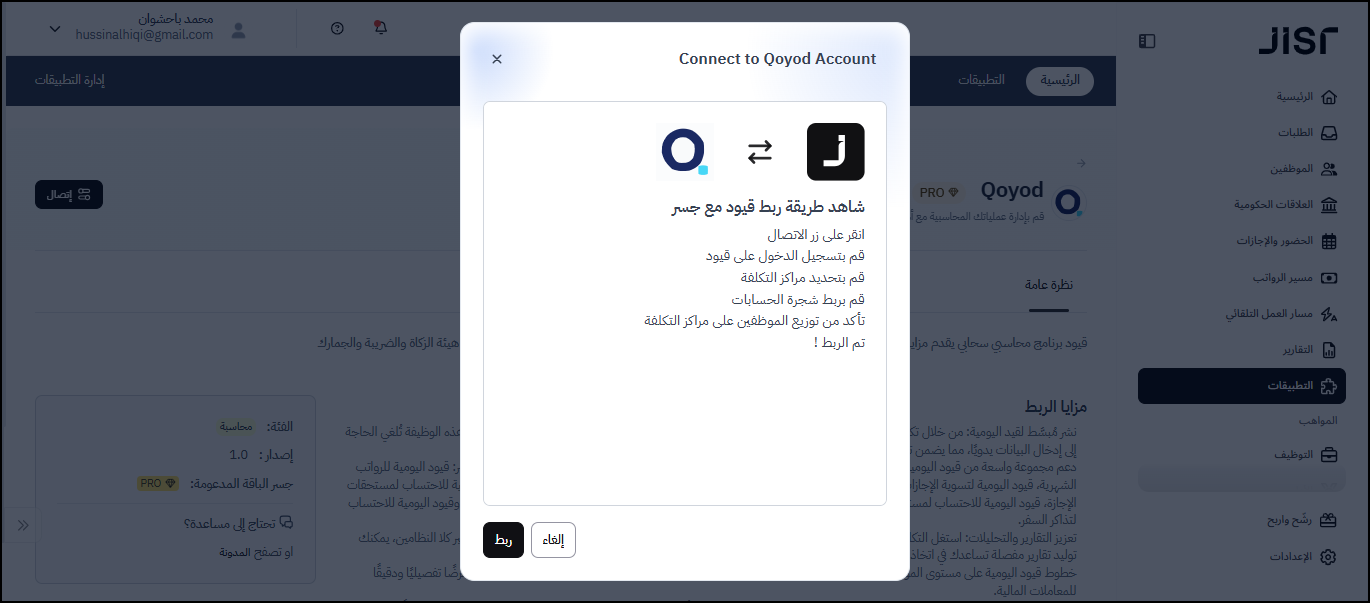 ملحوظة: ستظهر بطاقة الربط مع نظام قيود المحاسبي وستتاح إمكانية تنفيذ كافة الخطوات أعلاه للمستخدمين الذين يمتلكون إحدى الصلاحيات التالية على نظام جسر: صلاحية مشرف النظام أو من له دور مخصص يمتلك صلاحية "إدارة الربط والتطبيقات"