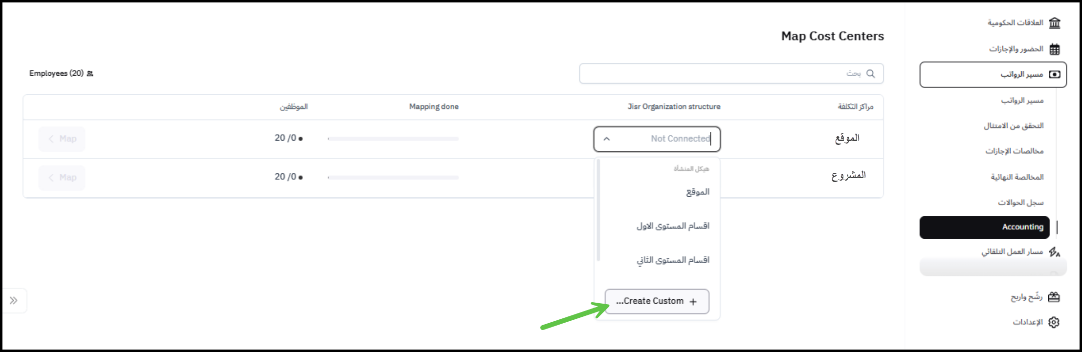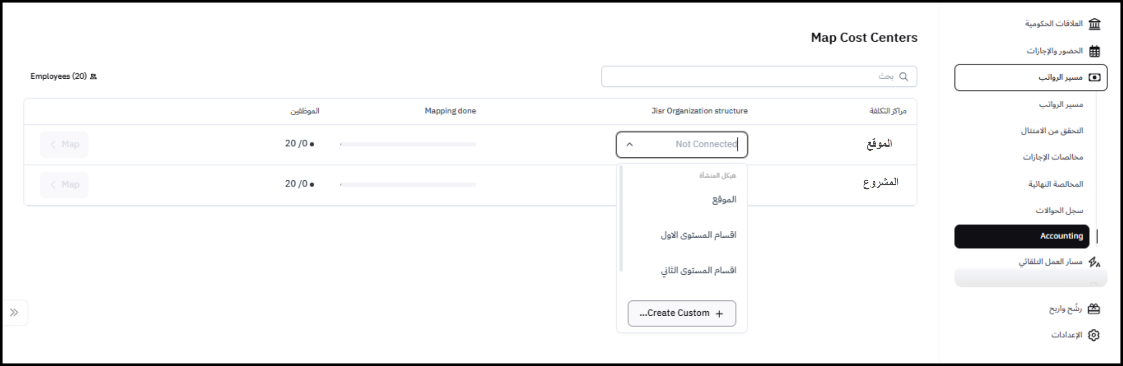 ملحوظة: يوفر نظام جسر للمستخدم إمكانية توزيع تكاليف الموظفين على مراكز التكلفة ويمكن للمستخدم معرفة المزيد من التفاصيل حول هذه الميزة من هنا.