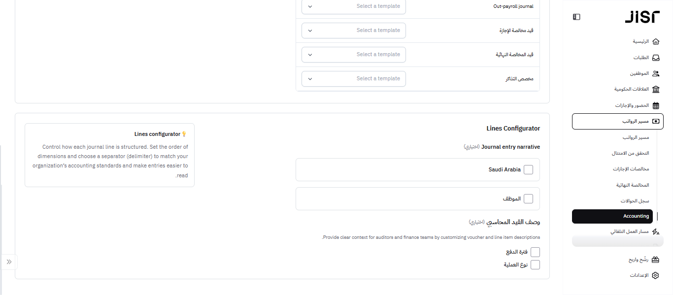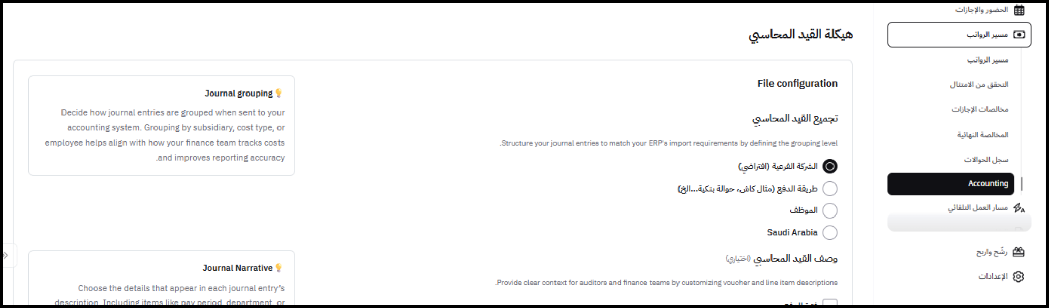 في هذه الخطوة ، يلزم على المسؤول تحديد طريقة عرض القيد المحاسبي (الشكل النهائي لقيود اليومية) بحيث تكون عبارة عن مجاميع أو بشكل تفصيلي لكل مركز تكلفة (إن وجد) أو على مستوى الموظف أو بناء على طريقة الدفع.