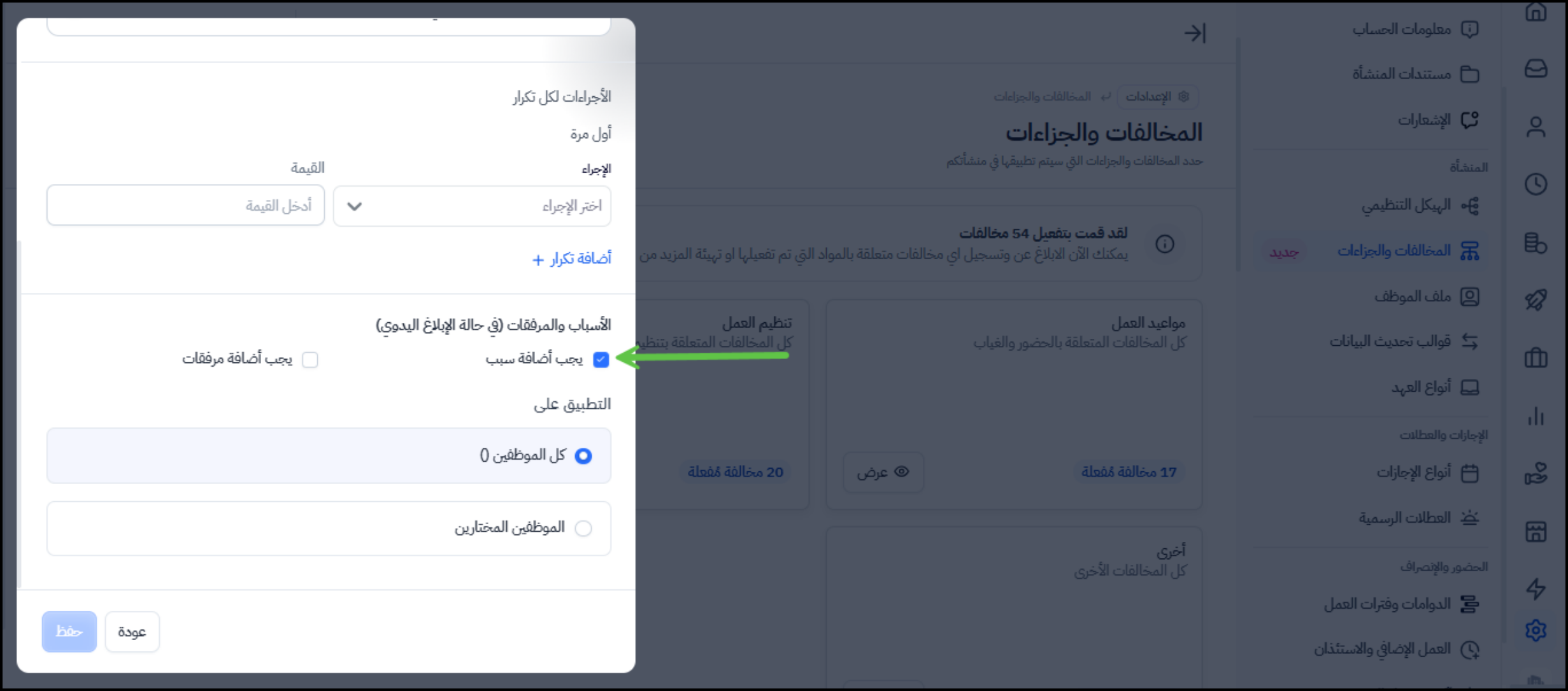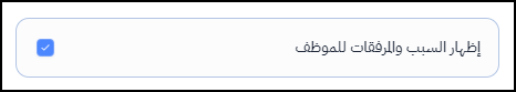 ملحوظة: يمكن للموظف الاطلاع على أي مرفقات تم تسجيلها في المخالفة وسبب المخالفة، إذا قام المستخدم بتفعيل مؤشر "إظهار السبب والمرفقات للموظف" أثناء تسجيل المخالفة.