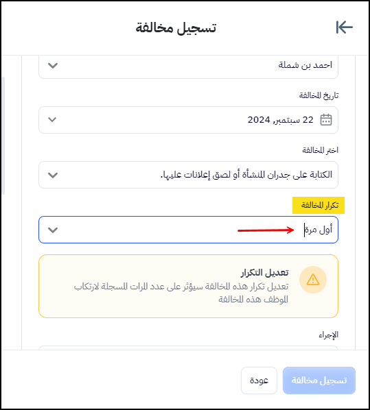 ملحوظة: إذا تم تسجيل مخالفة على موظف وكان قد سبق تكرار نفس المخالفة من نفس الموظف ستظهر "تكرار المخالفة" (ثاني مرة) بشكل آلي وفي حالة قيام المستخدم بتعديل التكرار لتقليل مرات تكرار المخالفة، ستظهر رسالة تنبيهية أن "تعديل تكرار هذه المخالفة سيؤثر على عدد المرات المسجلة لارتكاب الموظف هذه المخالفة".