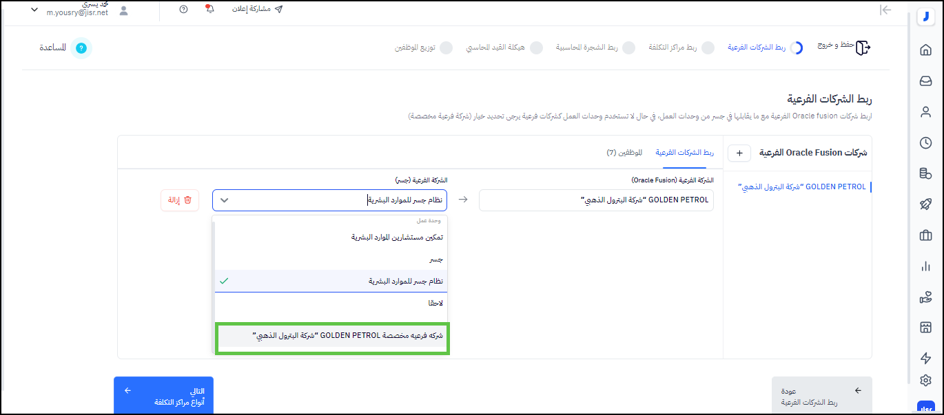 3- قم بربط كل شركة فرعية في أوراكال بما يقابلها من شركة فرعية (وحدة عمل) في جسر