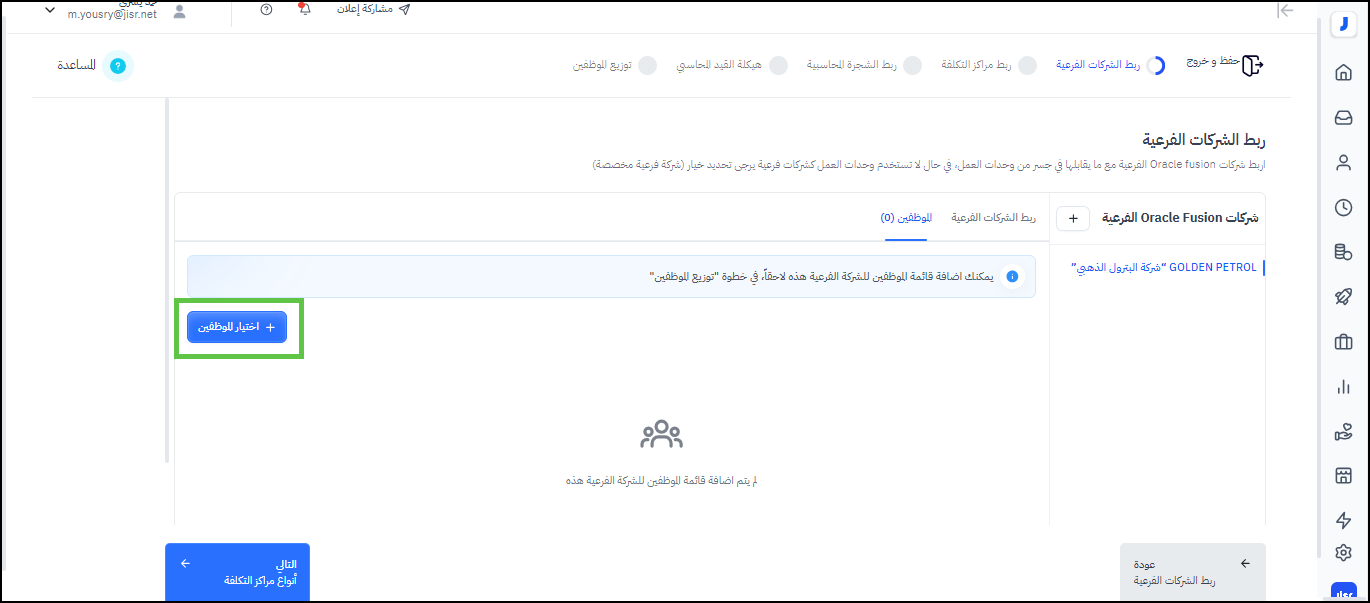 في حال إنشاء شركات فرعية مخصصة، يمكن لمشرف النظام من إضافة الموظفين للشركة الفرعية (إختياري).