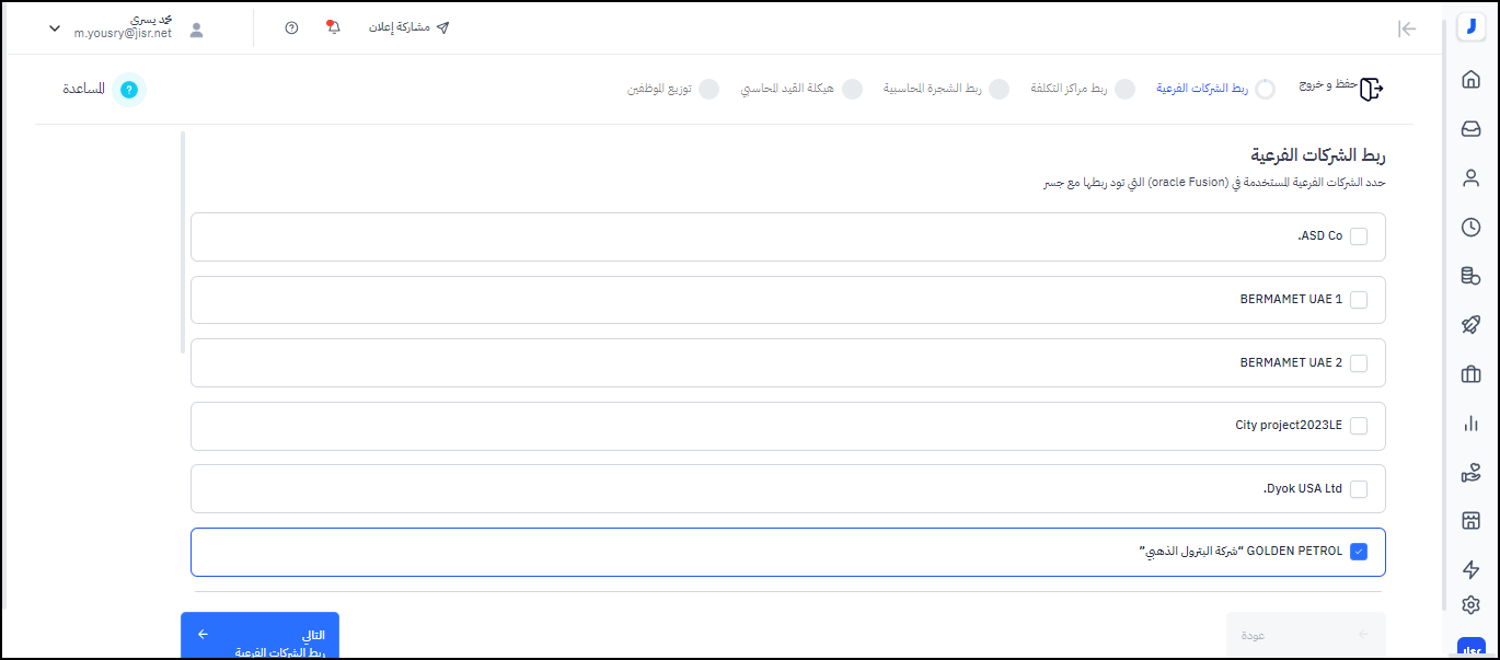 قد تظهر بعض بيانات شركات فرعية ك Dummy data من نظام أوراكال، لذلك على المستخدم اختيار الشركات الفرعية المُعرفة فقط في حسابه على أوراكال فقط ويريد ربطها مع نظام جسر.
