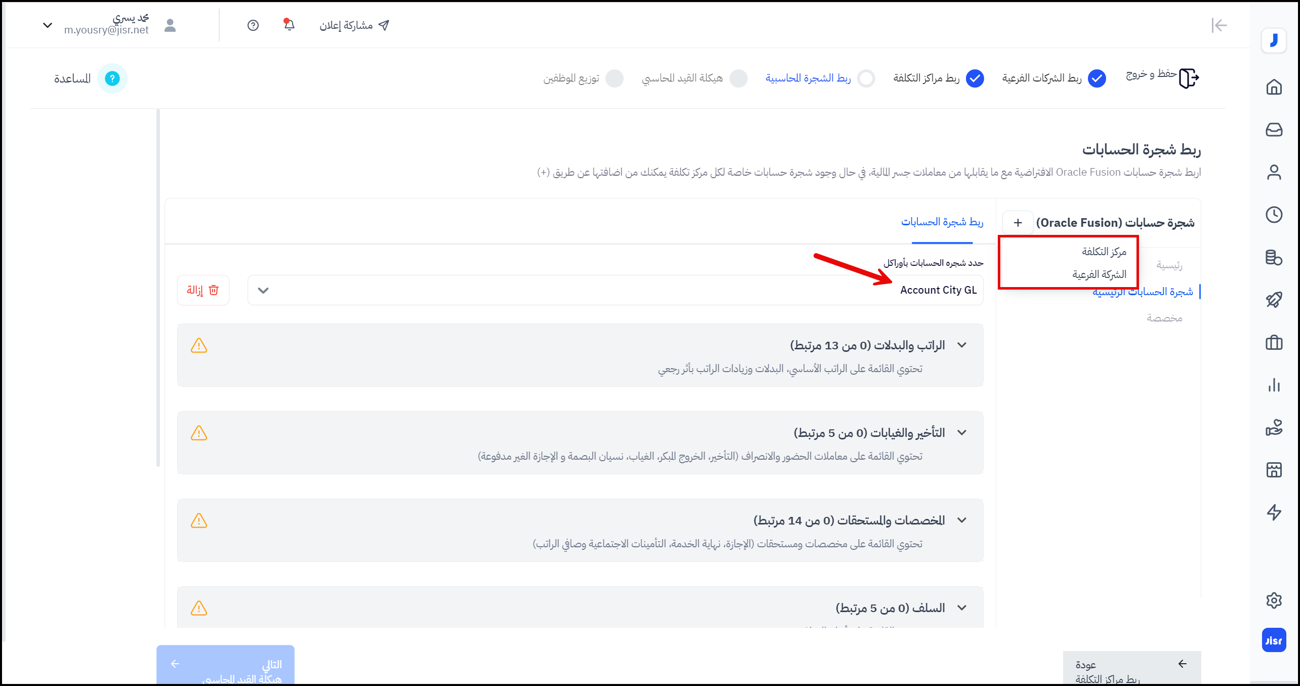 يمكن للمسؤول إجراء عملية الربط على مستوى الشركة الفرعية أو مركز التكلفة أيضاً لكن بعد ربط شجرة الحسابات الرئيسية.