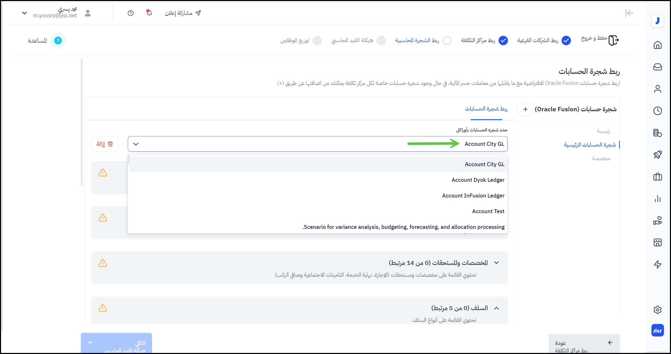 في هذه الخطوة، يستلزم على المستخدم ربط شجرة حسابات أوراكال فيوجن التي يقوم بتحديدها مع ما يقابلها من معاملات جسر المالية.