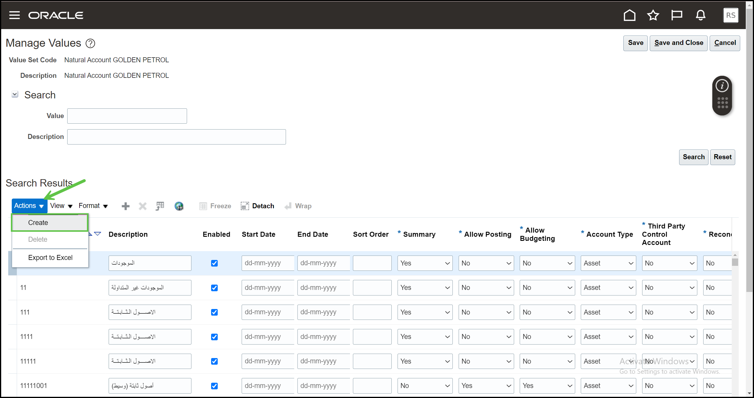 4- اختيار General Ledger في Module، ثم النقر على Search ثم اختيار ال Value Set Code، ثم النقر على Manage Values.