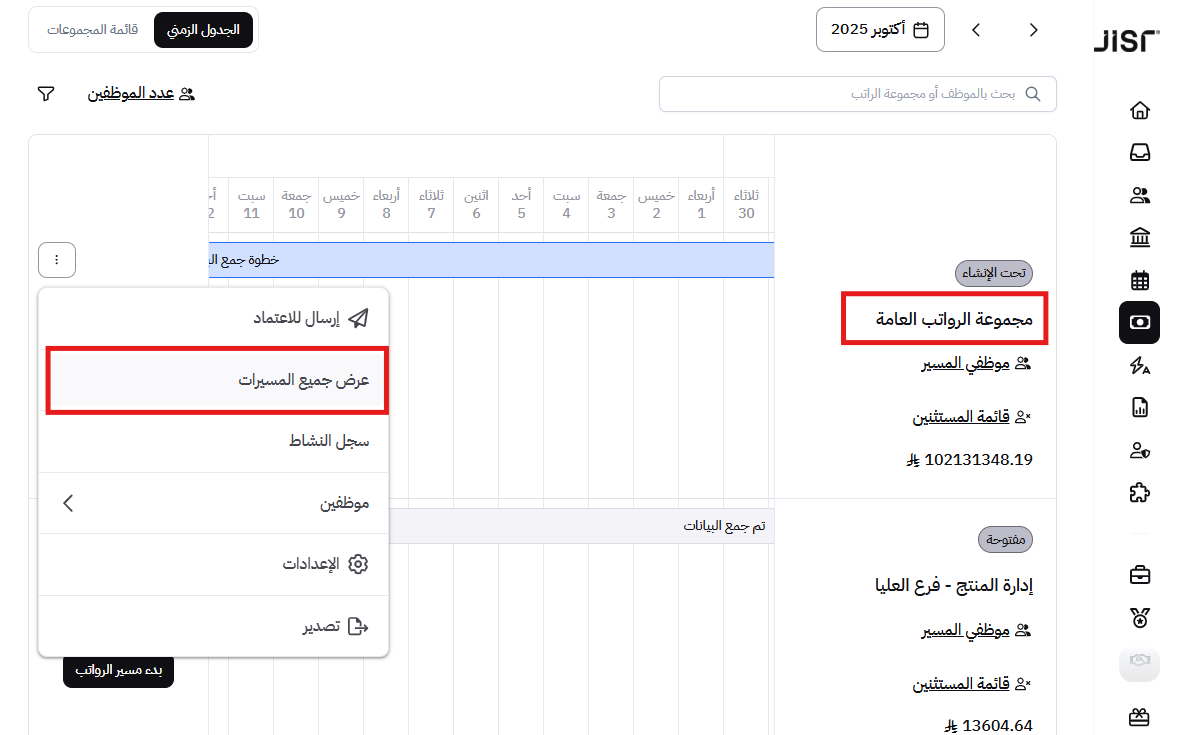2- اختيار "عرض جميع المسيرات" من قائمة الإجراءات الخاصة بمجموعة الرواتب المطلوبة