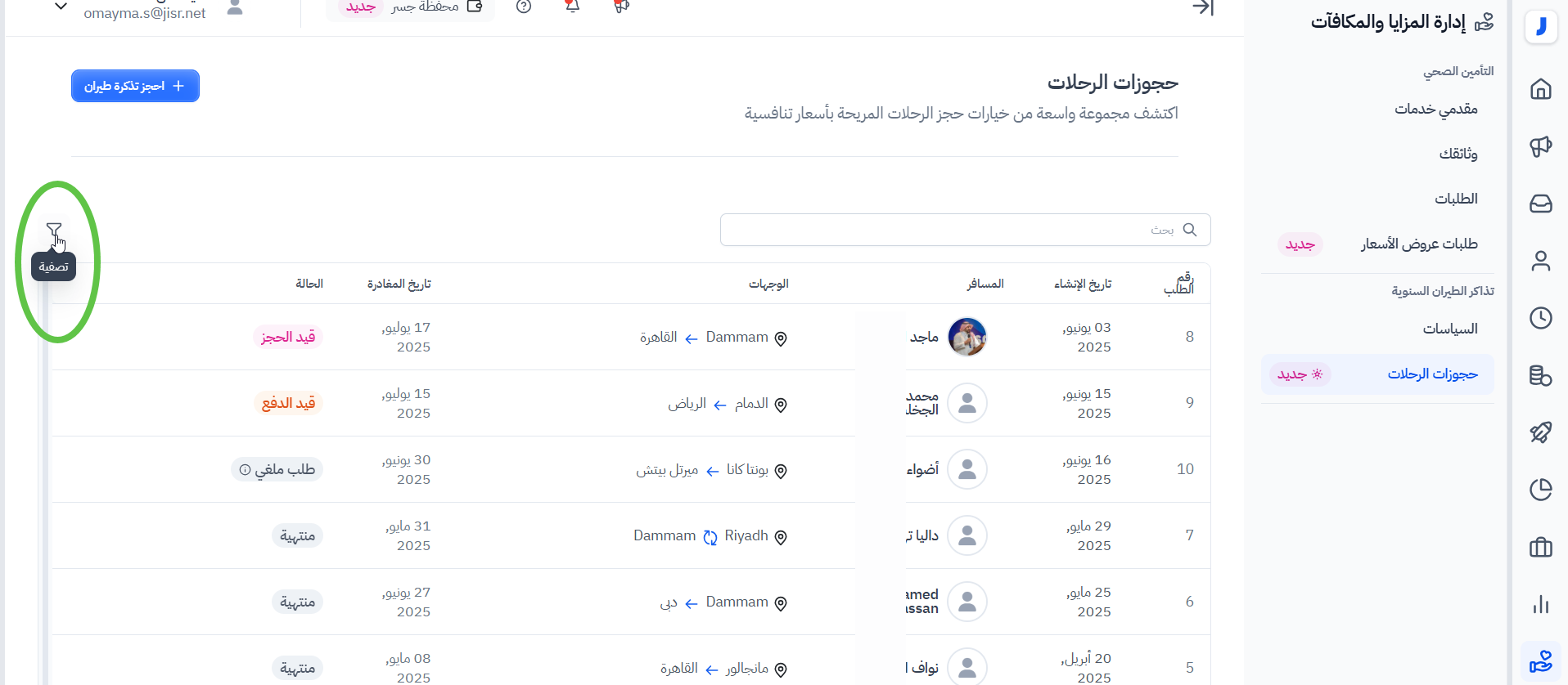 من خلال الربط مع المسافر، يمكن لفِرق الموارد البشرية والمستخدمين الذين لديهم صلاحية "إدارة قسم حجوزات الطيران" إدارة عملية طلبات وحجوزات تذاكر الطيران ودفعها لموظفي الشركة بسهولة تامة من خلال منصة جسر. مما يلغي الحاجة إلى إتمام الحجوزات عبر جهات متعددة، مما يجعل العملية أكثر كفاءة وتكاملًا.
