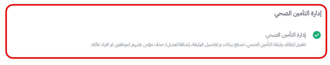 يمكن للمستخدمين الذين لديهم صلاحيات 'إدارة التأمين الصحي' أن يديروا بسهولة العمليات الخاصة بالتأمين الصحي، سواء لتجديد وثيقة تأمين صحي حالية أو لطلب عروض أسعار جديدة من مختلف المزودين للخدمة، وكل ذلك من مكان واحد ومن خلال عملية مبسطة.