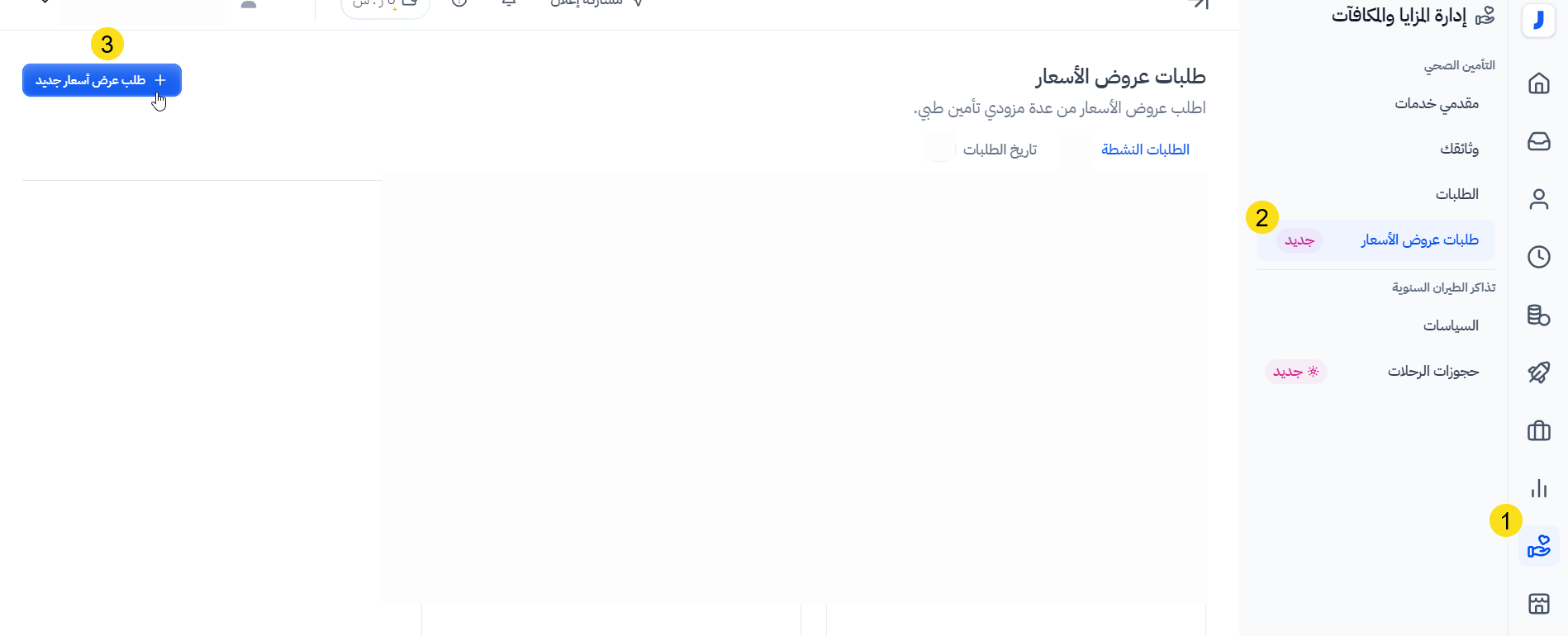 اضغط على 'إدارة المزايا والمكافآت'، ثم اختر 'طلبات عروض الأسعار' تحت 'التأمين الصحي'.