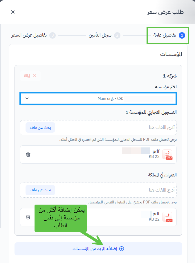 سيتم عرض نموذج؛ قم بملء قسم 'المؤسسات' بالمعلومات المطلوبة. يمكن للمستخدمين إضافة تفاصيل لعدة مؤسسات إلى ذلك الطلب، لذا إذا كانت الشركة الرئيسية لديها شركات تابعة تحتاج إلى إدراجها في التأمين، فيمكن إضافتها إلى نفس طلب العرض.
