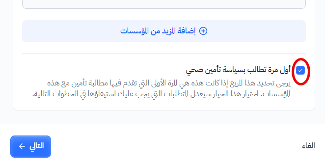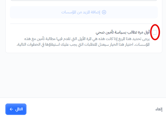 يرجى ملاحظة أنه إذا كانت هذه هي المرة الأولى لشركتك في تقديم مطالبة تأمين صحي، يجب اختيار هذا الحقل حتى يتم ضبط الأقسام التالية من الطلب وفقًا لذلك الاختيار.