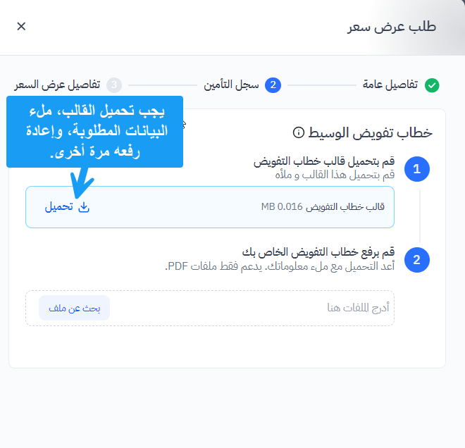 خطاب تفويض الوسيط: تتطلب هذه الخطوة إدخال خطاب تفويض الوسيط، الذي يُفوّض الوسيط للتصرف نيابةً عن الشركة. يتوفر قالب للتنزيل، ليتم تعبئته وإعادة رفعه.