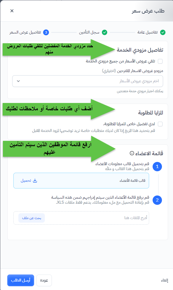في هذه الخطوة، نظرًا لأن هذه هي المرة الأولى للشركة في تقديم مطالبة تأمين صحي، ستتضمن طلبات العروض فقط تفاصيل مزودي الخدمة المطلوبين، وأي تفضيلات خاصة، وقائمة الأعضاء المتضمنين في التأمين.