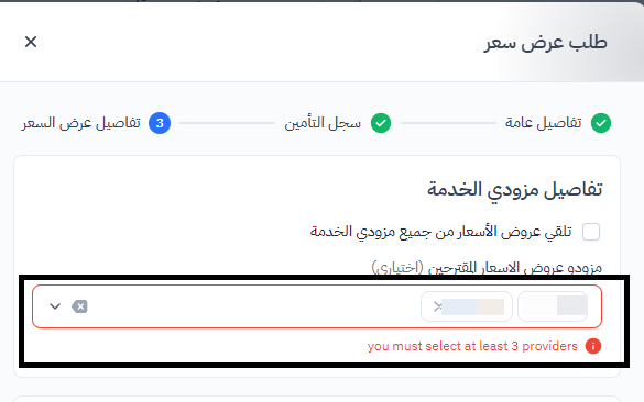 يرجى ملاحظة أنه يجب اختيار ثلاثة مزودين خدمة على الأقل لإكمال الطلب، ما لم يتم اختيار تلقي عروض الأسعار من جميع المزودين.