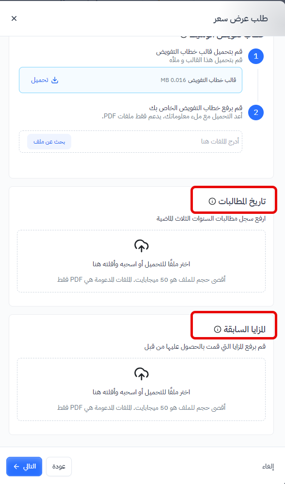 عندما تكون لدى الشركات مطالبات تأمين سابقة، سيتبع المستخدمون نفس الخطوات المذكورة لتقديم طلب على النظام. ومع ذلك، سيتم إضافة قسم جديد بعنوان 'تاريخ المطالبات' في خطوة سجل التأمين، مما يسمح للمستخدمين بتقديم سجل المطالبات الخاص بهم وتحميل مستند يوضح المزايا السابقة التي حصلوا عليها.