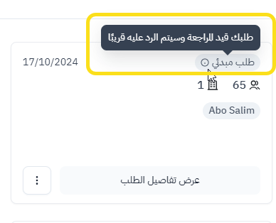 بعد تقديم الطلب، سيظهر تحت الطلبات النشطة بحالة 'طلب مبدئي' والذي يكون جاهز للمراجعة من قبل الوسيط.