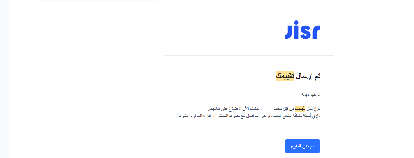 - عند استلام الموظف البريد الإلكتروني لإشعاره بأنه تم إرسال تقييمه، يمكنه متابعة تفاصيل التقييم من خلال الضغط على "عرض التقييم" الذي ينقله لنظام الأداء على حسابه في جسر.