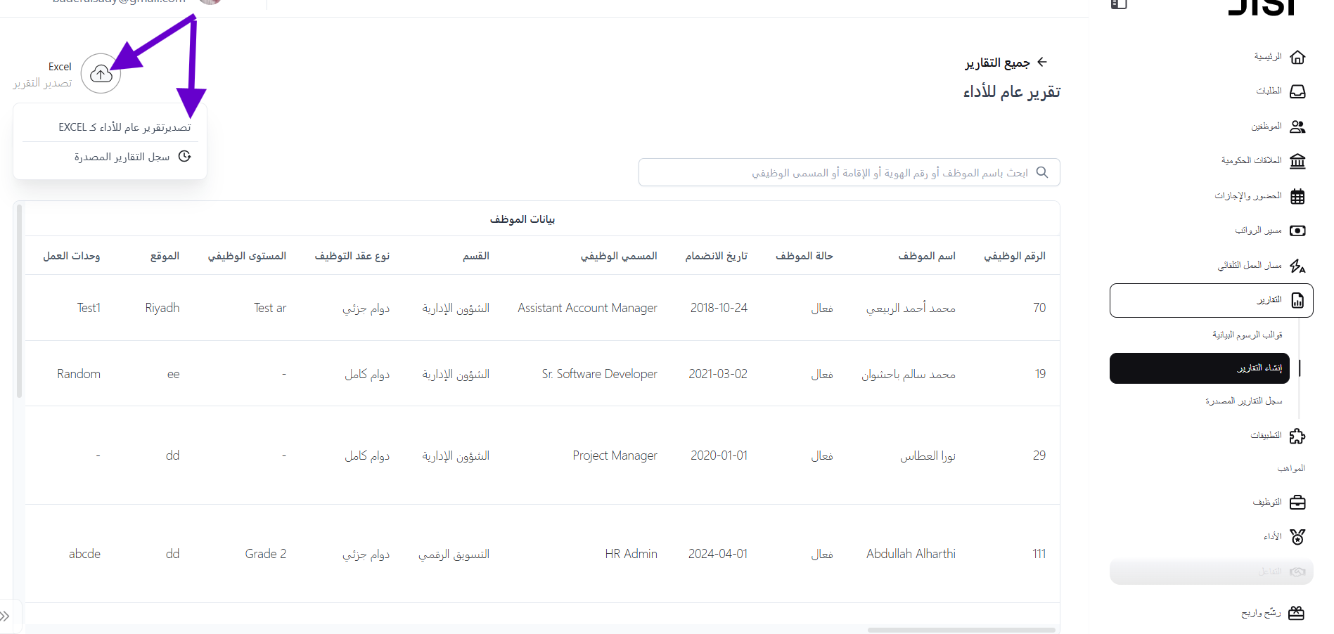 من خلال صلاحية "تصدير تقارير أداء الموظفين"، يتمكن المستخدمون من استخراج 'تقرير عام للأداء'، والذي يتم تحميله بسهولة. هذا التقرير هو ملف واحد يجمع كل تقييمات أداء الموظفين. سيوفر التقرير المعلومات التالية: