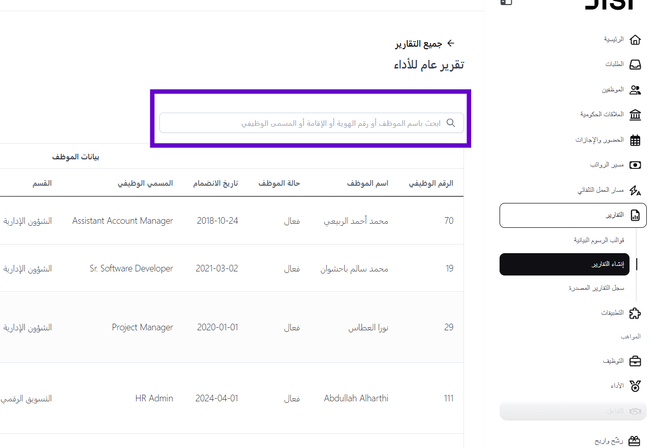 - بعد تحديد التفاصيل المطلوبة في التقرير وعرض تقييمات كل الموظفين في المدة المحددة، يمكن البحث بإسم الموظف، أو برقم الهوية، أو برقم الإقامة وذلك في حالة الرغبة ف عرض تفاصيل نماذج التقييم الخاصة بموظف معيّن.