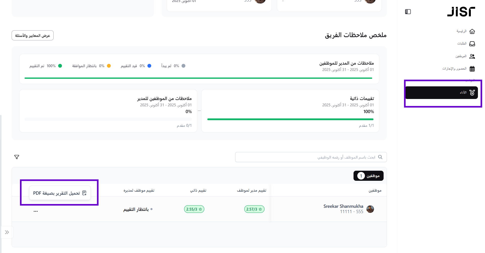 - عند عرض التقييم من ملف الموظف، يمكن للموظف تحميل تقرير التقييم كملف PDF من خلال الضغط على "تحميل التقرير بصيغة PDF".