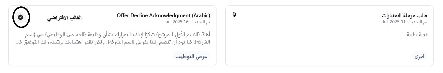 جميع القوالب، سواء كانت مُضاف مسبقًا بواسطة نظام جسر أو مُنشأة يدويًا بواسطة المستخدمين، يمكن اختيارها بسهولة عند إرسال رسائل البريد الإلكتروني أو جدولة الاجتماعات من ملفات المرشحين. تعرف على المزيد حول استخدام القوالب في التواصل مع المرشحين.