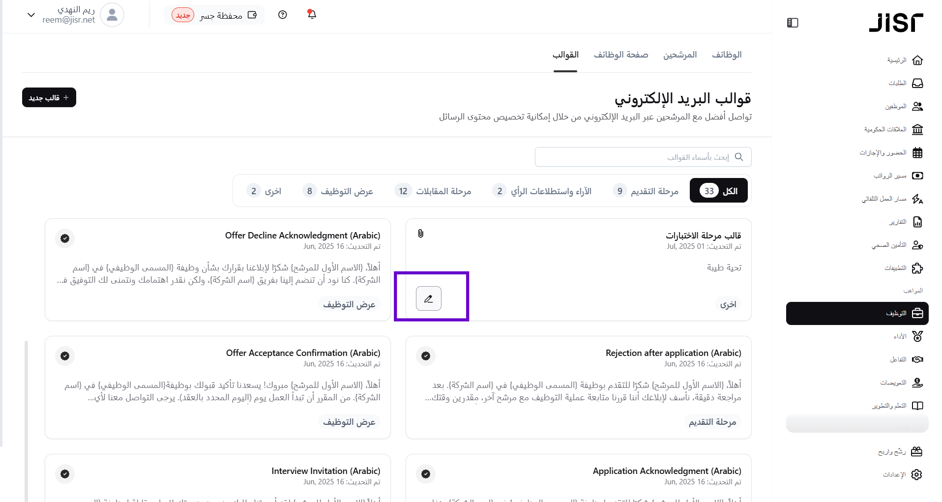 في صفحة 'قوالب البريد الإلكتروني'، ستجد القوالب المتاحة (التي يوفرها نظام جسر) مدرجة حسب الموضوع.