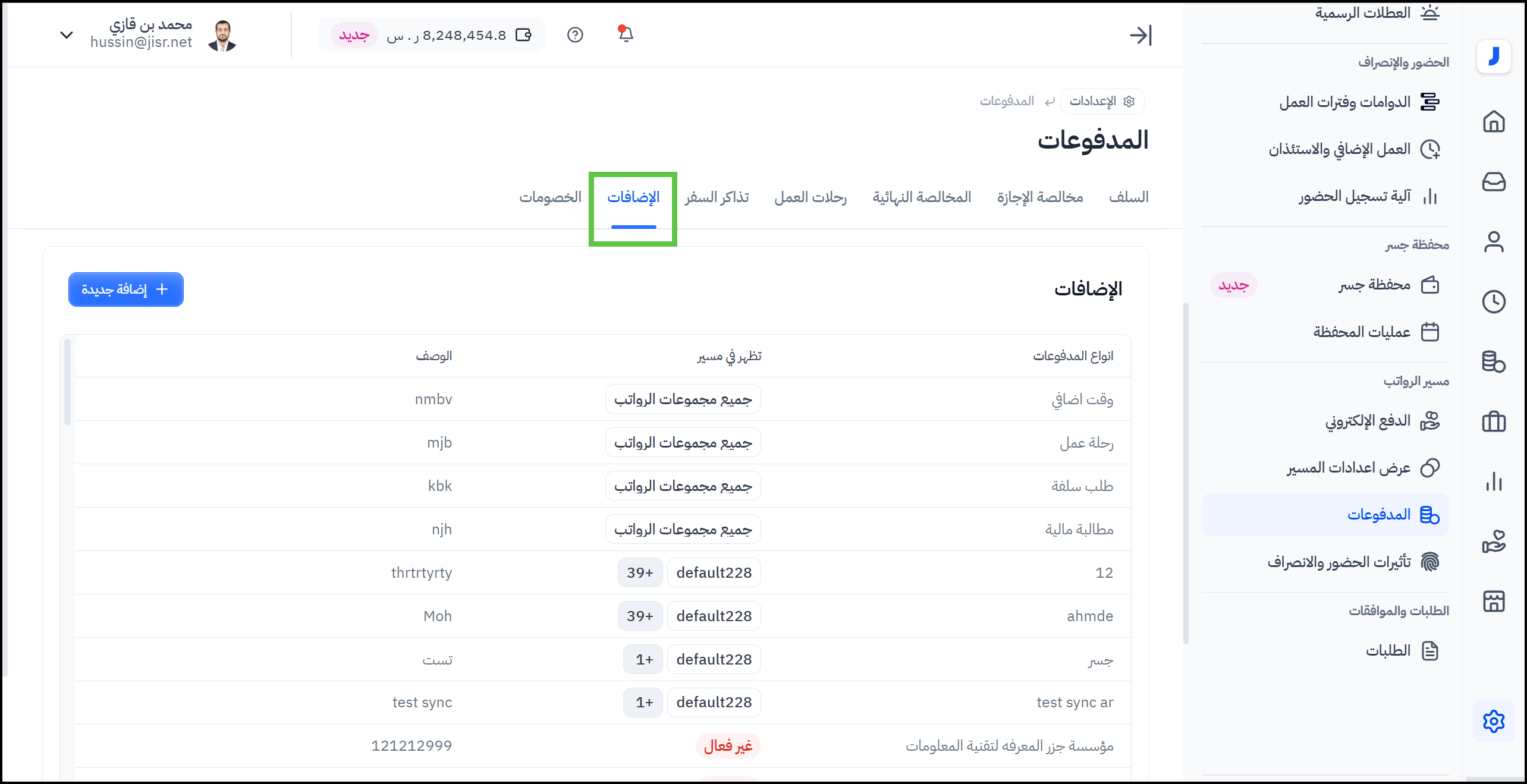 3- عند النقر على تبويب "الإضافات" أو "الخصومات" ستظهر كل الإضافات والخصومات التي تم تسجيلها في النظام.