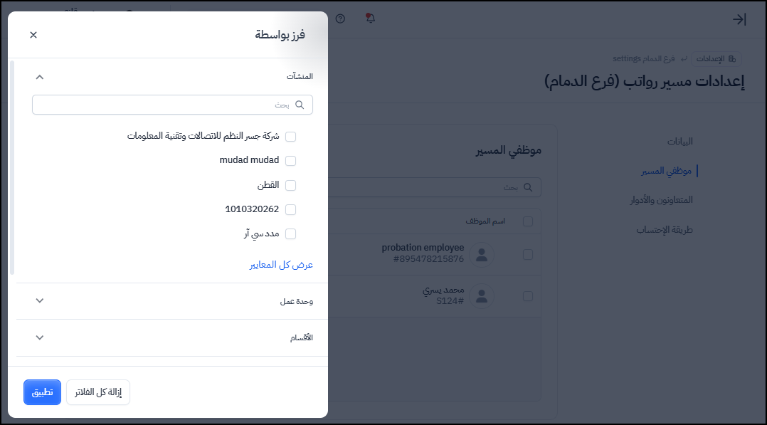 كما يمكن للمستخدم البحث عن موظفين محددين من خلال عملية الفلترة