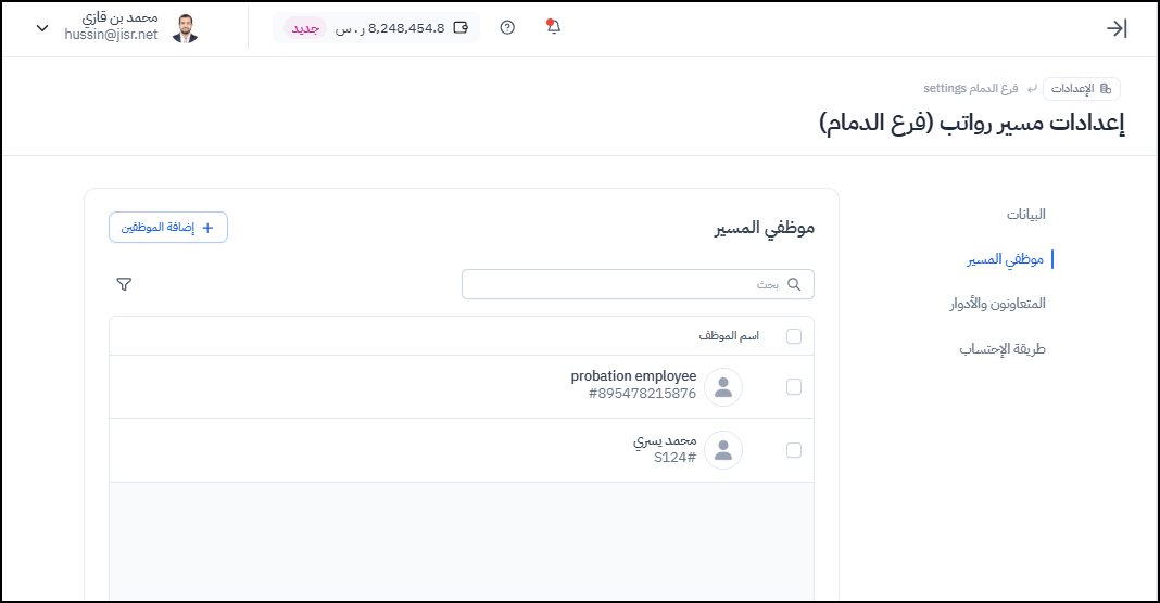 تظهر قائمة الموظفين في النظام وهم الموظفين المراد إدخالهم في مسير الرواتب المحدد