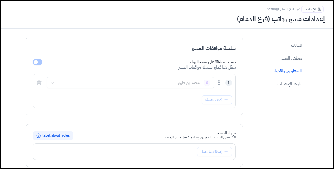 في هذا التبويب يتم وضع سلسلة المراجعة والموافقة داخل مسير الرواتب