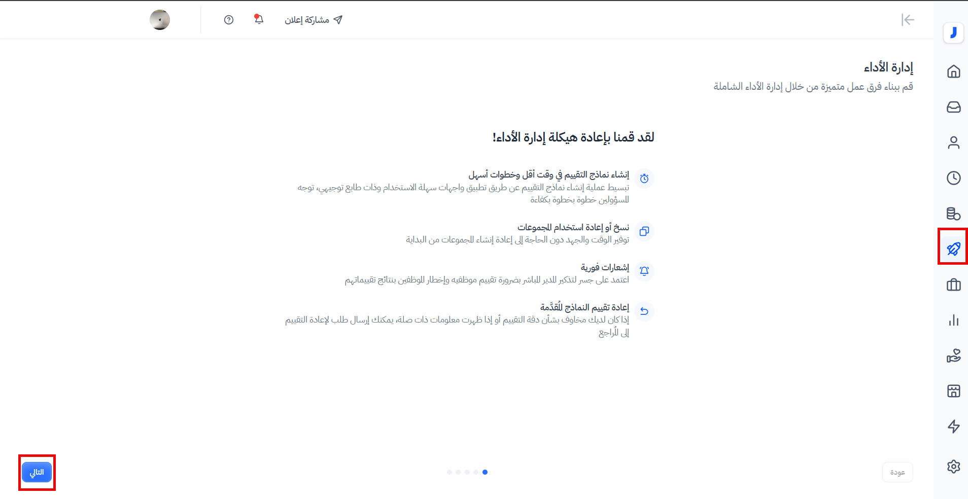 عند الضغط على "الأداء" من الصفحة الرئيسية، سيتم عرض خطوات تعريفية توضح المزايا الخاصة بالتجربة الجديدة للأداء. ستقوم بالضغط على "التالي" حتي تصل إلى صفحة "إعداد طرق التقييم".