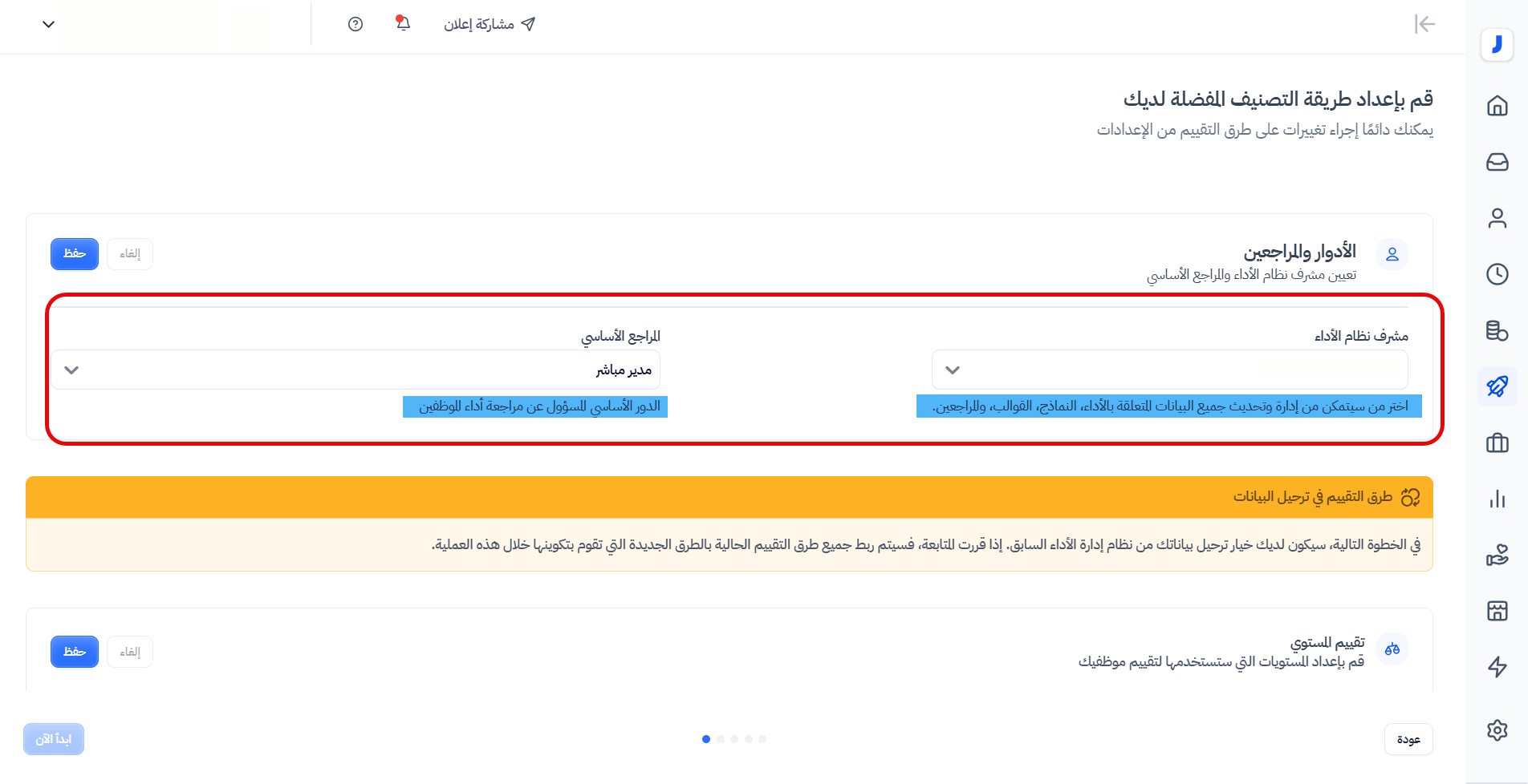 لن تظهر البيانات الخاصة بتقييماتك المضافة في نظام الأداء الحالي بنفس الآلية (المستويات،النسب المئوية/أو المسميات) في نظام إدارة الأداء الجديد، بل ستظهر هذه التقييمات بآلية التقييم الجديدة التي قمت بحفظها في هذه الصفحة. ولن تتمكن من العودة مرة أخرى لتغييرها لأن عملية الترحيل ستكون تمت بالفعل، وأي تحديثات في آليات التقييم من الإعدادات ستنعكس فقط على أي تقييمات جديدة وقادمة.