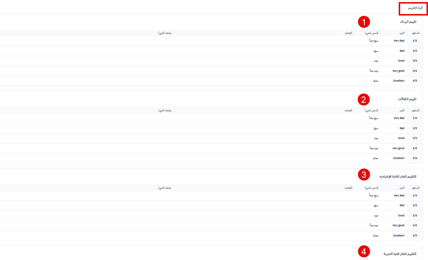 - في نظام إدارة الأداء الحالي يوجد 4 آليات لتقييم الأداء: (تقييم الهدف، تقييم الكفاءات، التقييم العام للفترة الإعتيادية، التقييم العام لفترة التجربة). ويمكن اختيار أن يكون تقييم كلًا منهم (مستوى، أو نسبة مئوية).