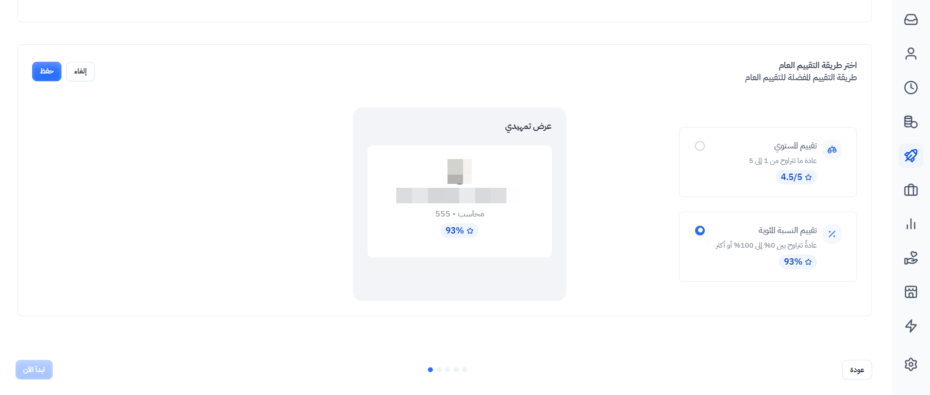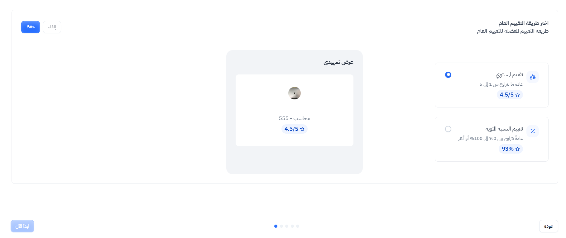 - تحديد الطريقة المفضلة التي ستستخدم في طريقة التقييم العام (مستوى، أو نسبة مئوية)
