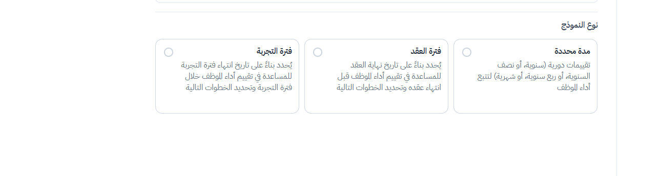 - في نظام إدارة الأداء الجديد، أنواع نماذج التقييم هي: مدة محددة، فترة العقد، فترة التجربة.