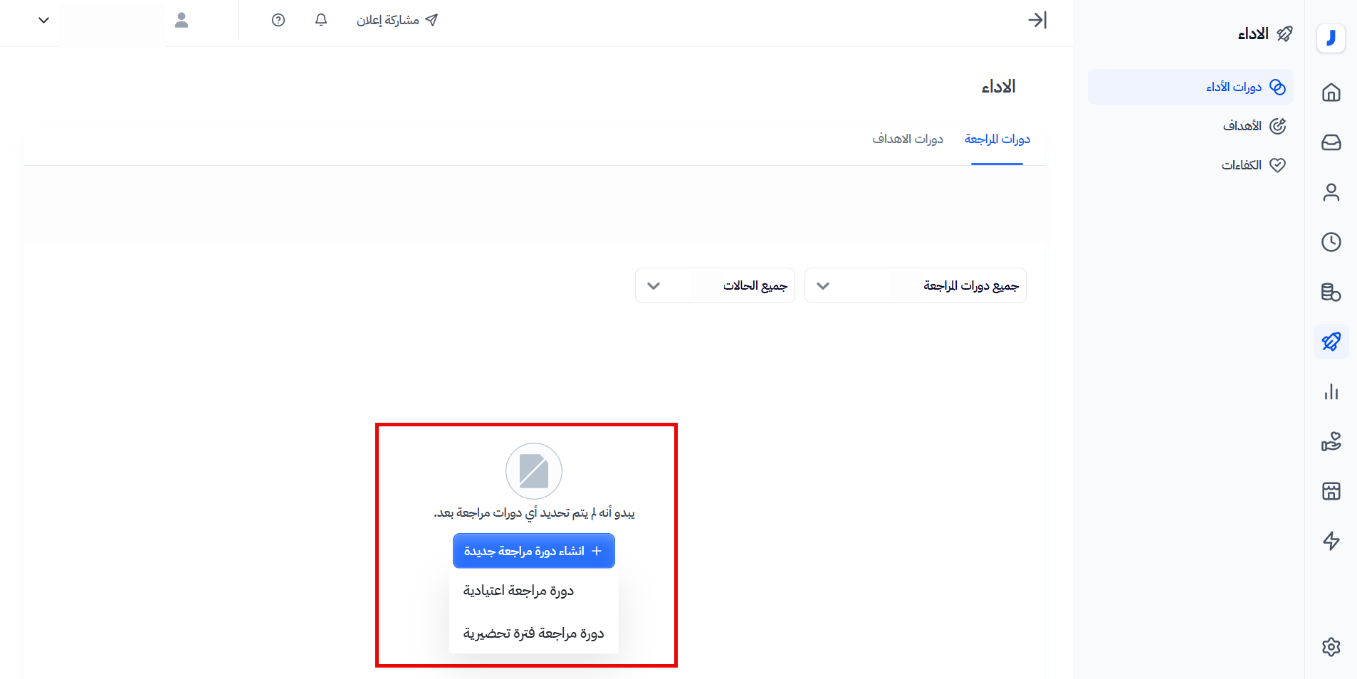 إذا كان هناك بيانات سابقة خاصة بتقييمات الأداء على النظام الحالي ستواجه خطر خسارتها، وعند بدء استخدام الميزة الجديدة للأداء لن تجد التقييمات المسجلة لموظفيك وستقوم ببدء استخدام خاصية الأداء من جديد.