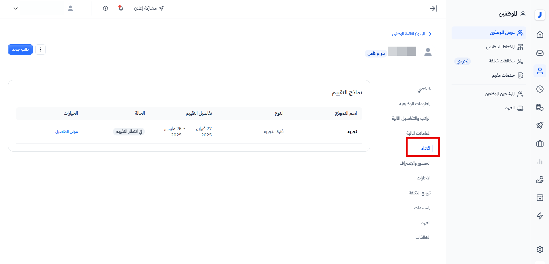 - كما أن في التجربة الجديدة، نماذج التقييم تنعكس على ملف الموظف وتظهر به. أي، عند إضافة موظف إلى نموذج تقييم يتم إضافة اسم النموذج، وحالته وتفاصيله في ملف الموظف حتى يمكن تتبع أدائه من قبل المديرين والمشرفين بسهولة.