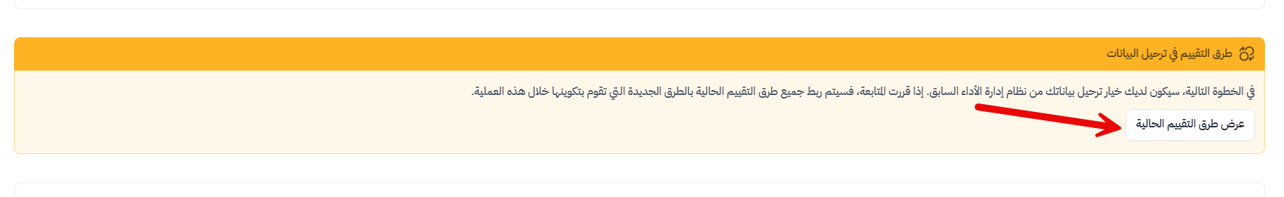 - الطلب من المستخدمين ادخال نفس طرق التقييم التي يتبعونها في النظام الحالي للأداء قبل الضغط على "ترحيل" وذلك لضمان أن تكون تقييماتهم المرحّلة دقيقة ومطابقة لسجل تقييماتهم الفعلي من النظام الحالي للأداء.