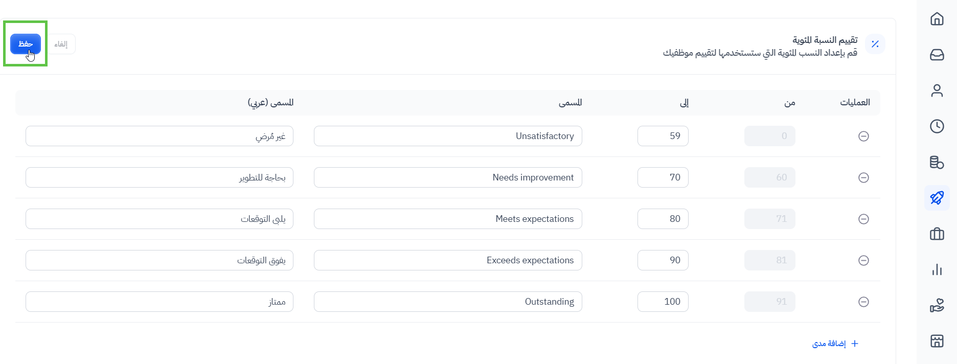 - نسبة مئوية (إعداد النسب المئوية التي سيتم استخدامها لتقييم الموظفين)