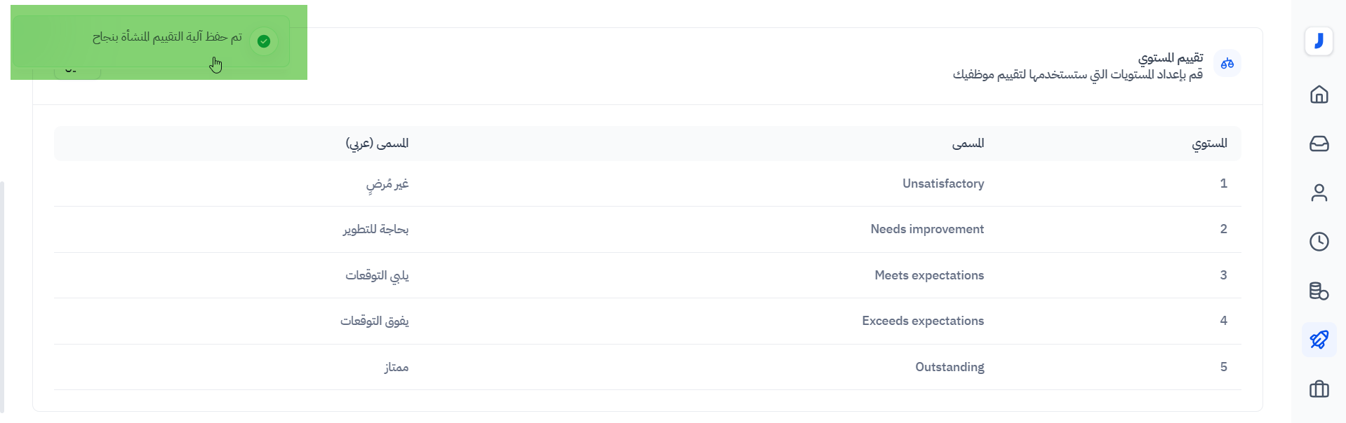 - مستوى (إعداد المستويات التي سيتم استخدامها لتقييم الموظفين)